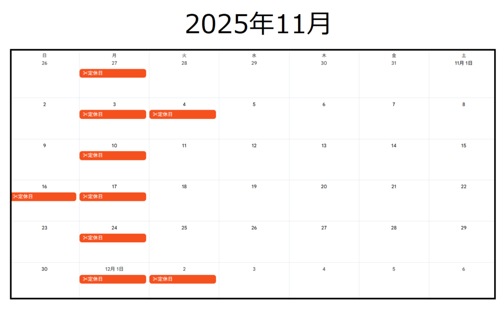 (パーマ、カラー 17:00まで)定休日 毎週月曜日、